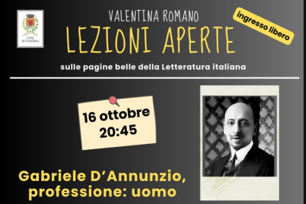 Conferenza-Convegno Evento Culturale Gabriele D'Annunzio, professore: uomo condividi Quando 16/10/2025 Dove Sala Polifunzionale Conferenza a cura di Valentina Romano Evento gratuito organizzato dalla biblioteca Altri link informazioni Portami qui: Gabriele D'Annunzio, professore: uomo
